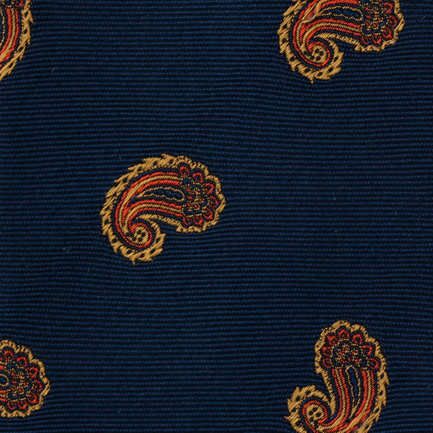 たとえばこちらのペイズリーネクタイは、1cm程度のペイズリーモチーフの中に紫とグリーン、オレンジの3色を使用し、1mmほどの非常に細いラインで柄を形成しています。