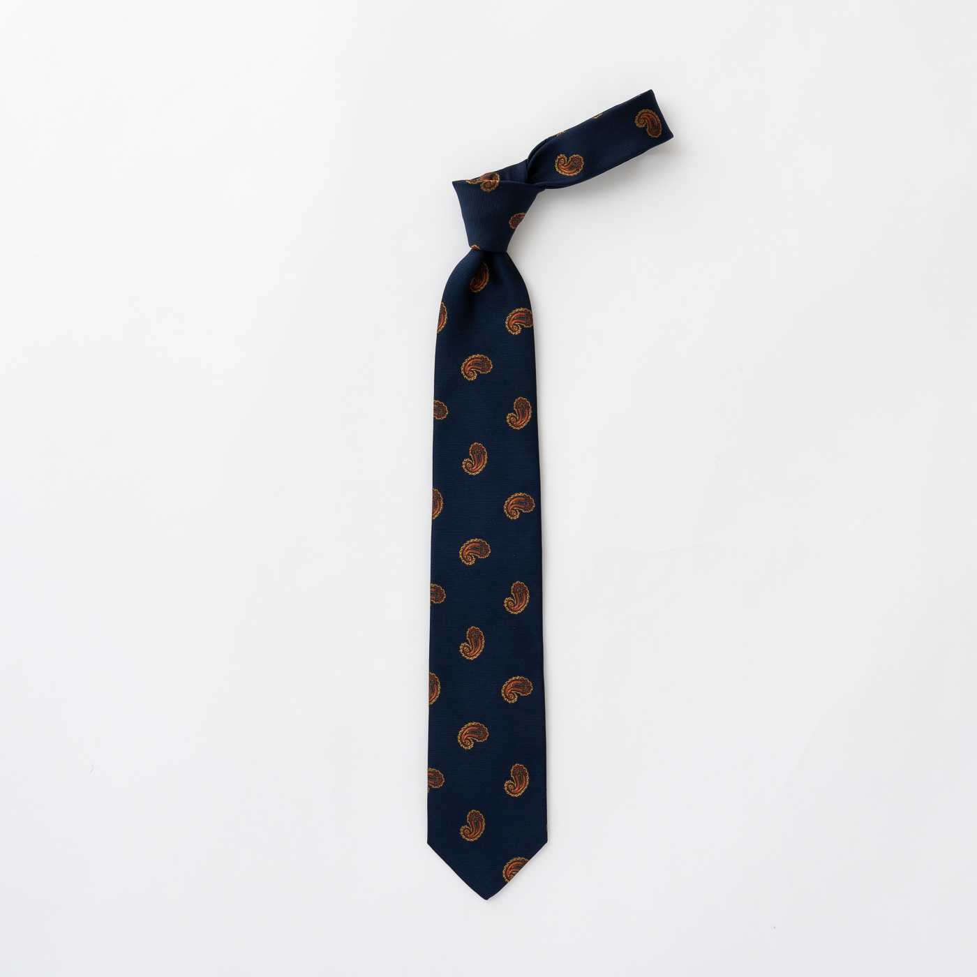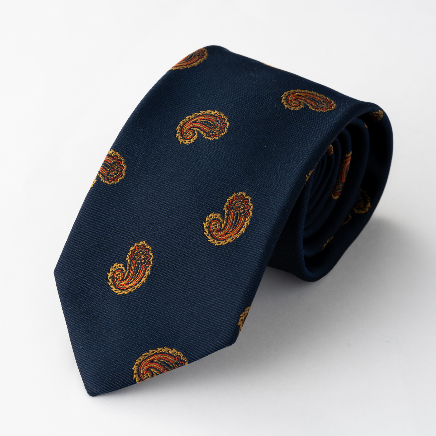 一つめは、1mm単位の細かい柄が特徴のペイズリータイ。ペイズリーはハードルが高いと感じている方もいるかもしれませんが、スーツと同系色をベースとしたネクタイを選ぶとコーディネートに取り入れていただきやすいです。