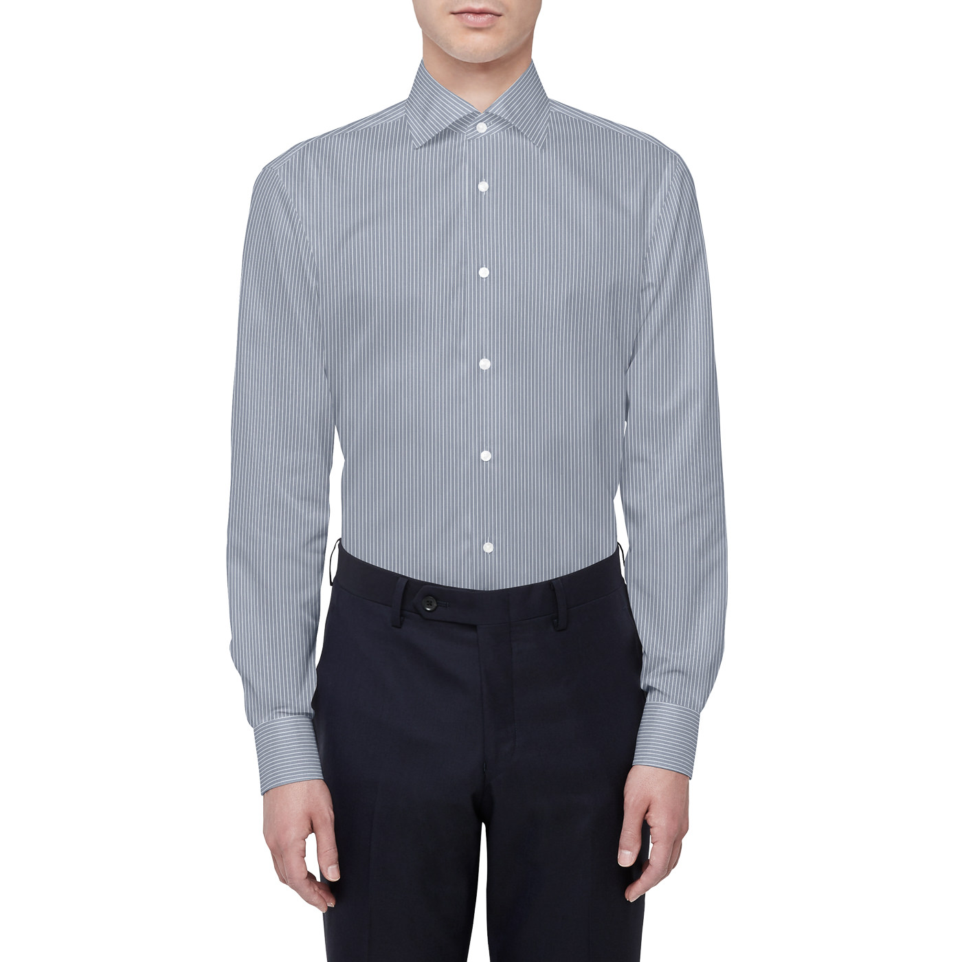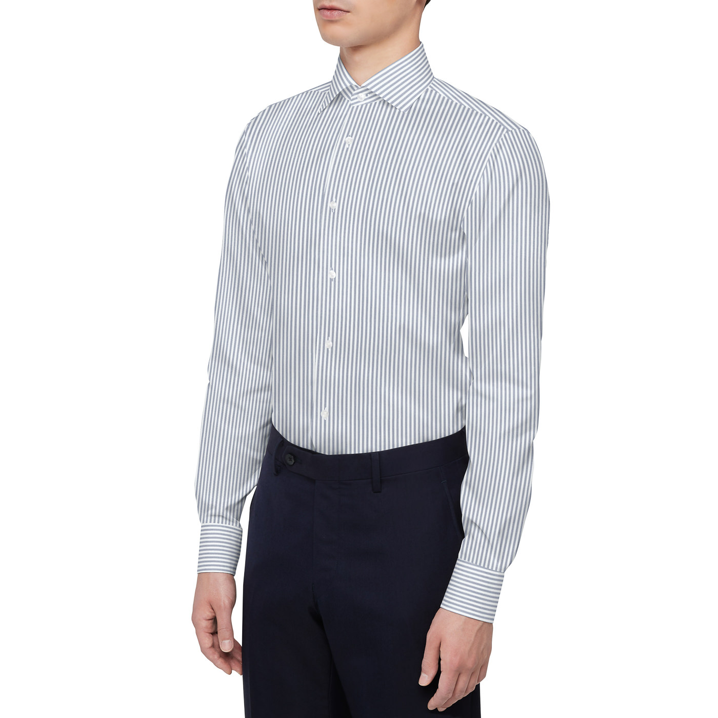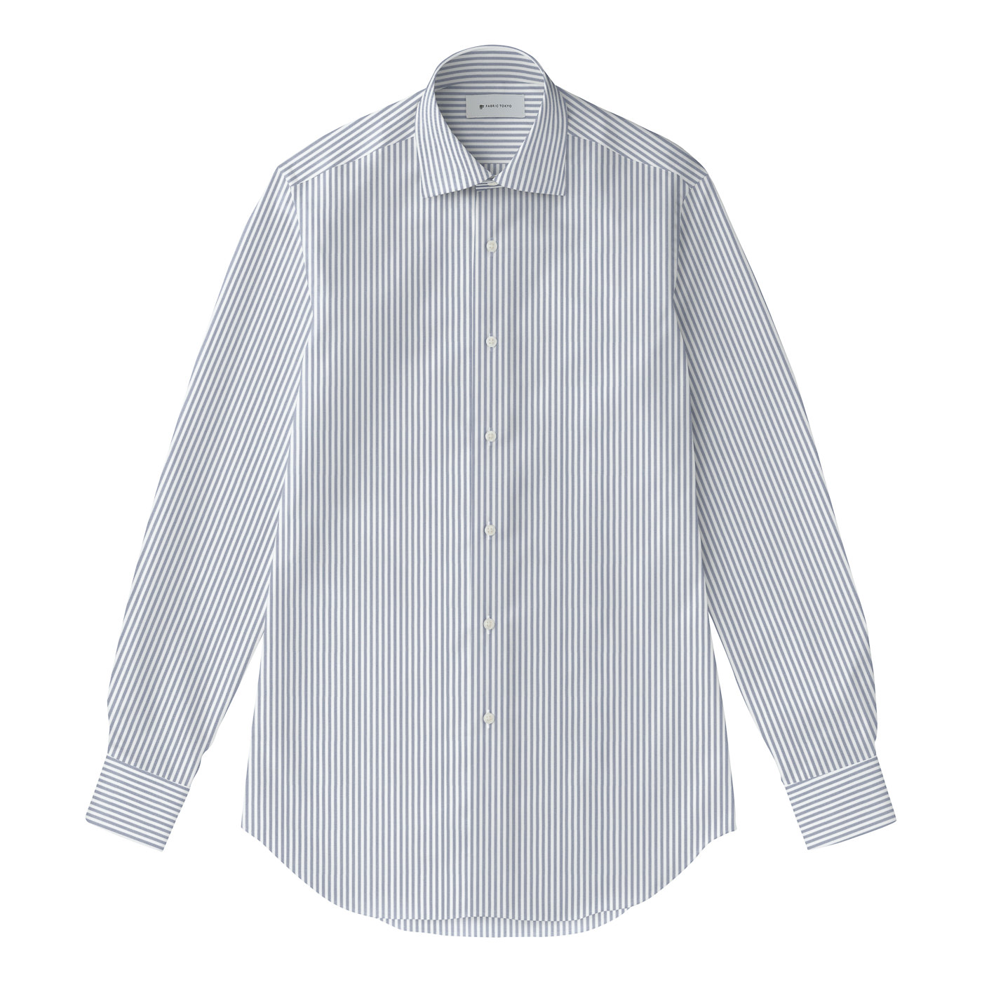 シャツのネイビークラスターストライプは少しグレーがかった色味なので、グレーのジャケットで合わせるとまとまりやすくなりますよ。