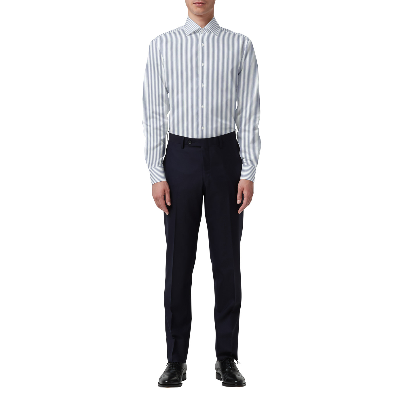 シャツのネイビークラスターストライプは少しグレーがかった色味なので、グレーのジャケットで合わせるとまとまりやすくなりますよ。