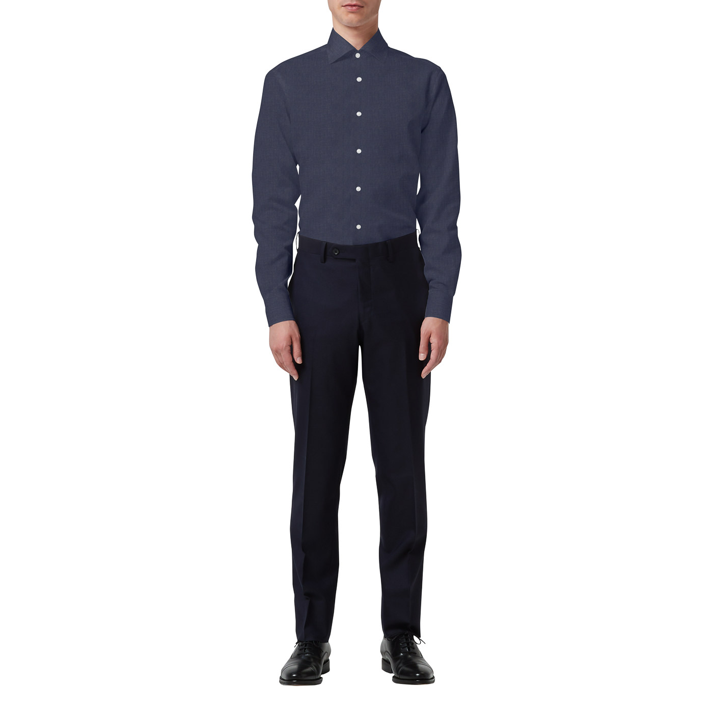 ネイビーのチノパンを軸にして、ブルー系の色味で統一した爽やかさのあるコーディネートです。そのまま私服でも使えそうな都会的で洗練された雰囲気で、スニーカーに合わせてもカジュアルすぎず上品に見えます。