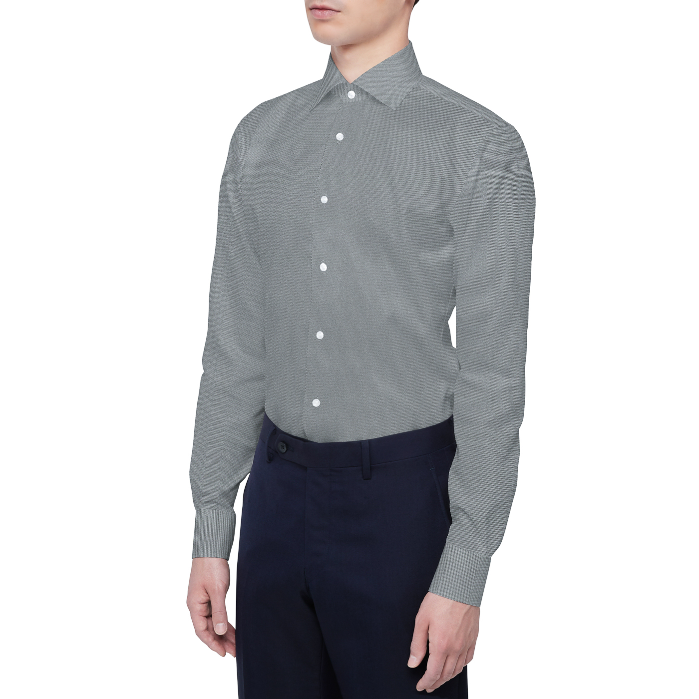 ふっくらとしてコットンの風合いが際立つ生地で、ビジカジスタイルのインナーとしてぴったり。生地がしっかりしているので、ノーネクタイでもちょうどいい襟の立体感になります。