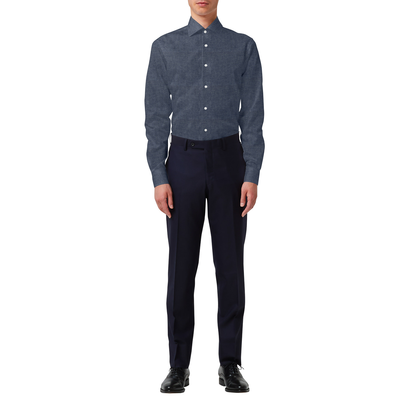 セットアップにシャツを合わせた王道のコーディネートを、シャツの襟をスタンドカラーにした現代風なコーディネートです。