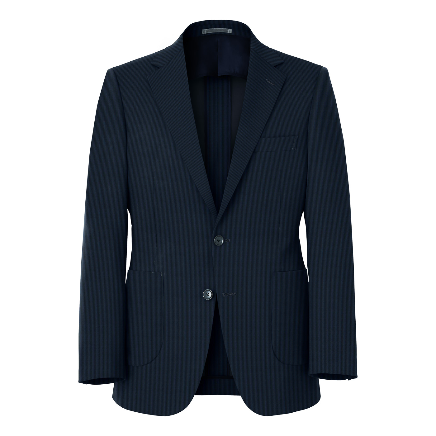 セットアップにシャツを合わせた王道のコーディネートを、シャツの襟をスタンドカラーにした現代風なコーディネートです。