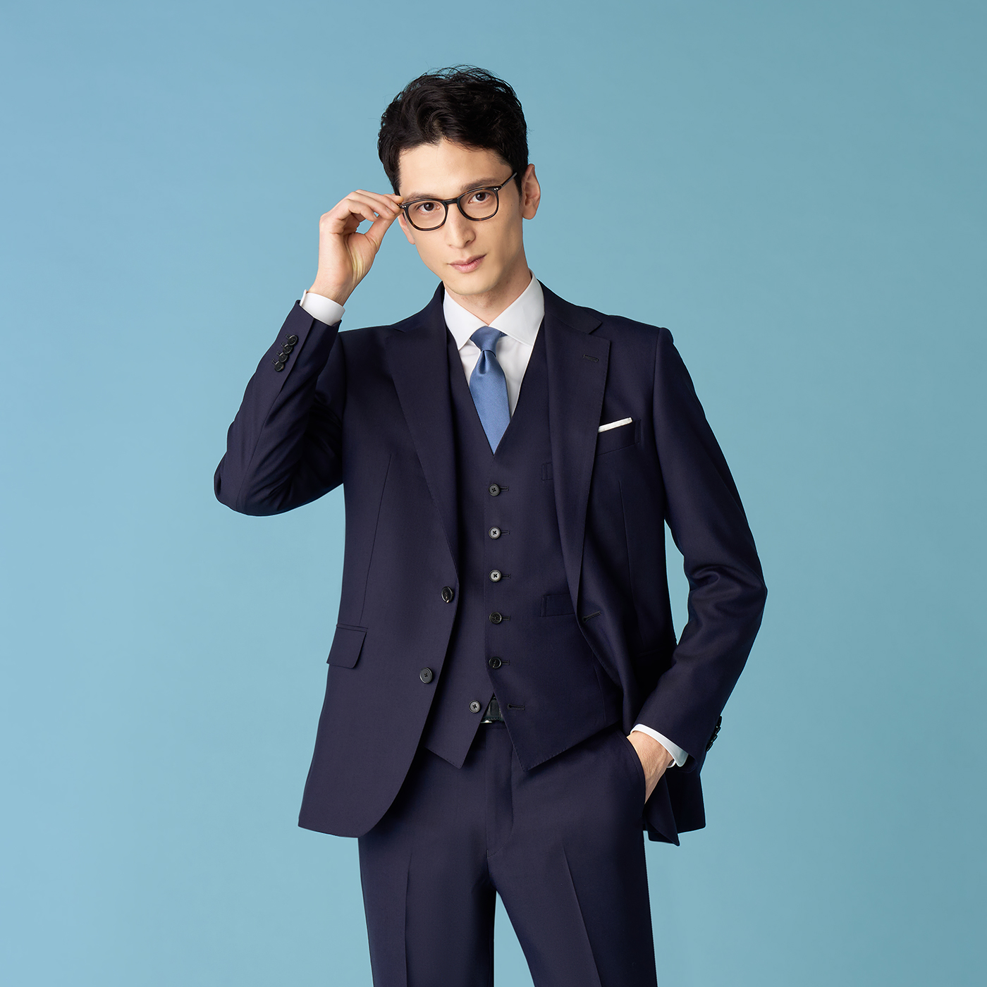 王道のネイビースーツをお探しの方におすすめ。世界三大ウール産地の一つとして知られる尾州の上質なウールを使用したFABRIC TOKYOのオリジナル生地です。 ツーピーススーツをみる スリーピーススーツをみる