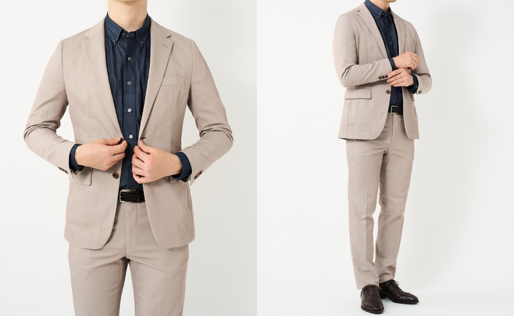 自然由来の発色で柔らかさがあり、光沢と艶は控えめでナチュラルな風合い。コットンスーツのような着こなしも楽しめます。