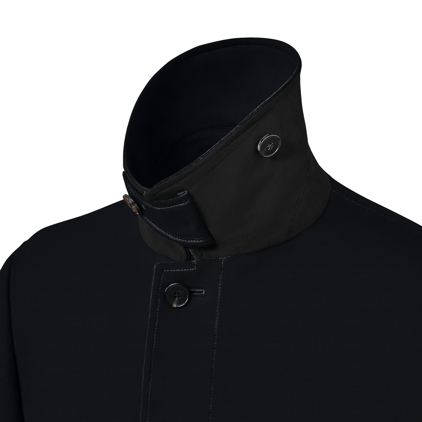 ビジネスの王道といえるステンカラーコートです。生地は高密度な綾織りが特長のギャバジンで、美しいドレープ性が魅力。さらに、ストレッチ性が高く、ウールの復元力によってシワがつきにくいため、お手入れも簡単です。厚みを抑えた軽量な生地だから、秋口から春先まで長く着られるのも魅力といえます。