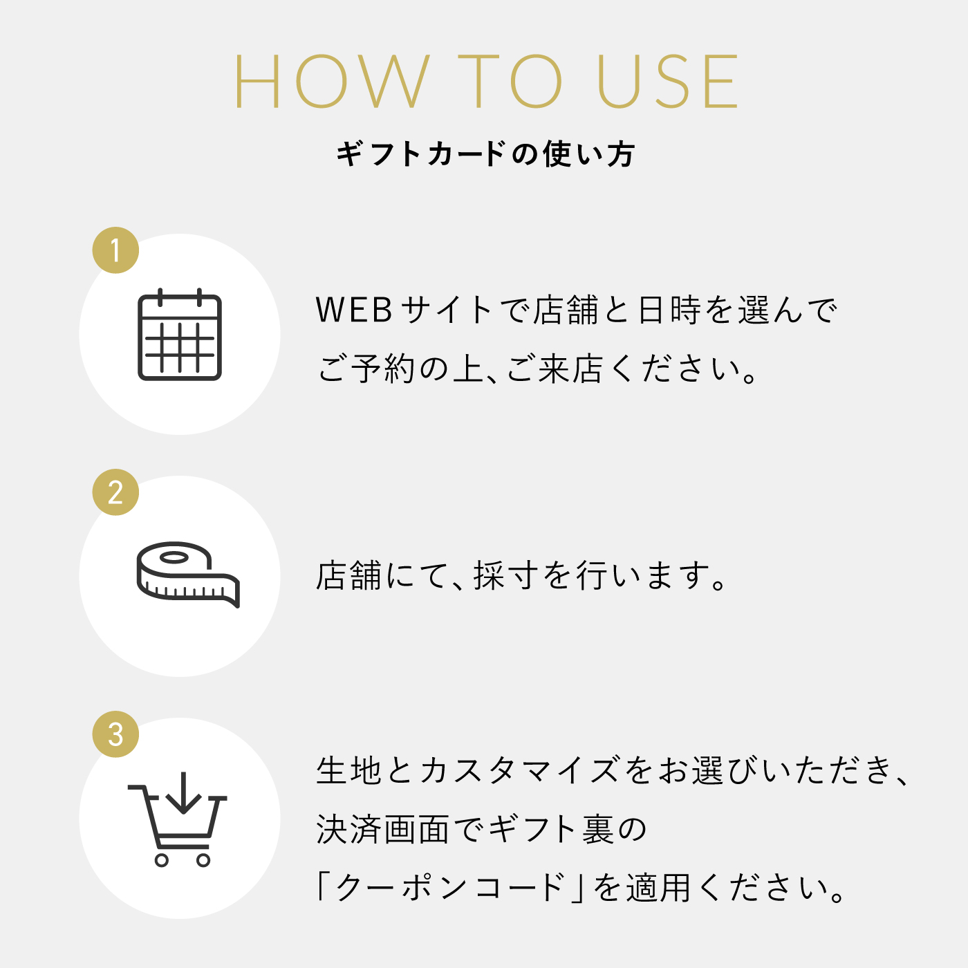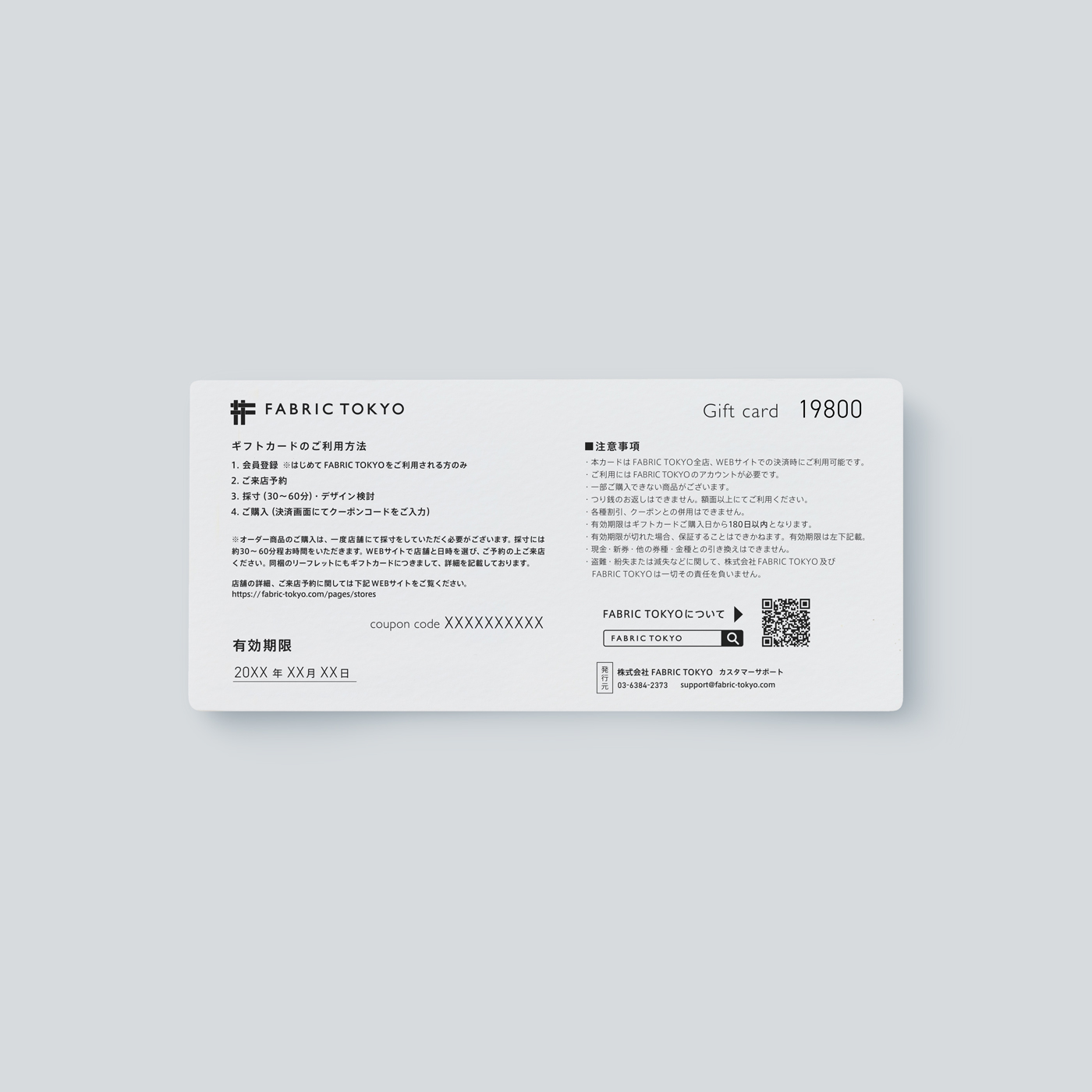 オンライン購入だけでなく、FABRIC TOKYO全店でオーダーギフトカードがその場で購入が出来ます。当日お持ち帰り頂きたい方は、お近くの店舗にお気軽にお越し下さい。