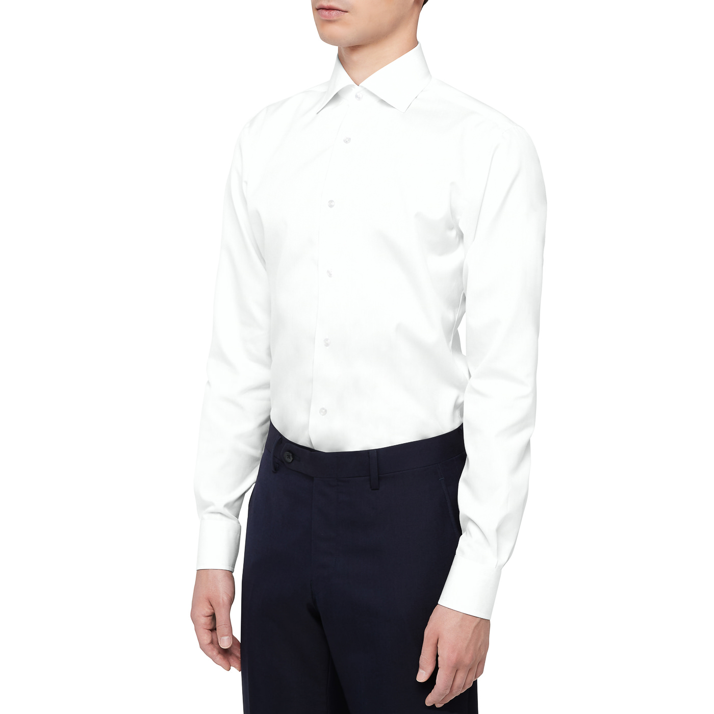 たとえば首が細い人がシャツの第1ボタンを開けると、首と襟にスペースが生まれて首の細さが強調されてしまいます。一方ドゥエボットーニなら、襟が首に沿ってすっきりと立つので、首が細くても襟元のシルエットをきれいにキープできます。