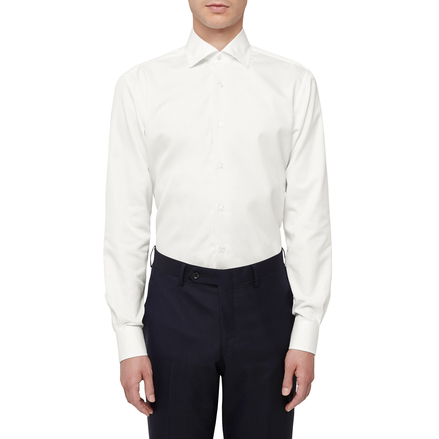 装飾が付いておらず、一般的なシャツとの違いは襟と比翼の仕立てのみで、スーツとの相性もよく爽やかな印象があります。