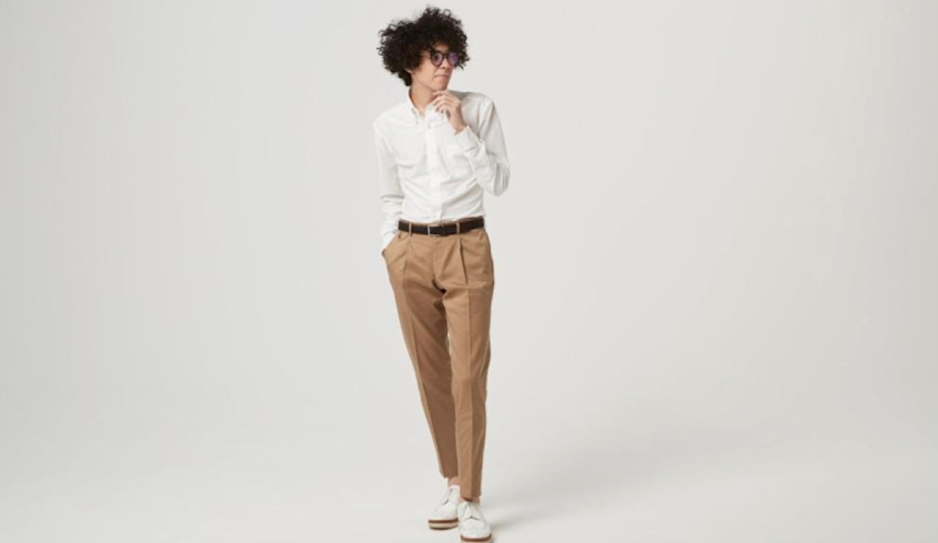 チノパンは素材やシルエットを変えることで定番のベージュのチノパンもビジネスシーンにふさわしいスタイリッシュな見た目を作ることが出来ます。