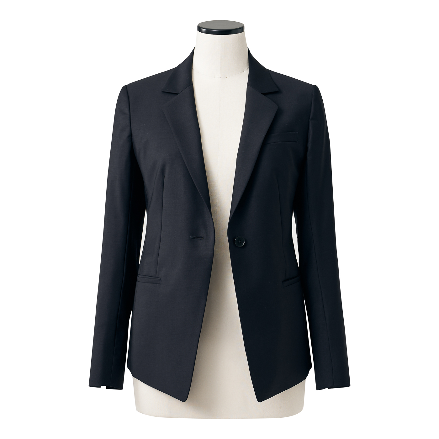ジャケットの前下がりのシルエットが特徴的
