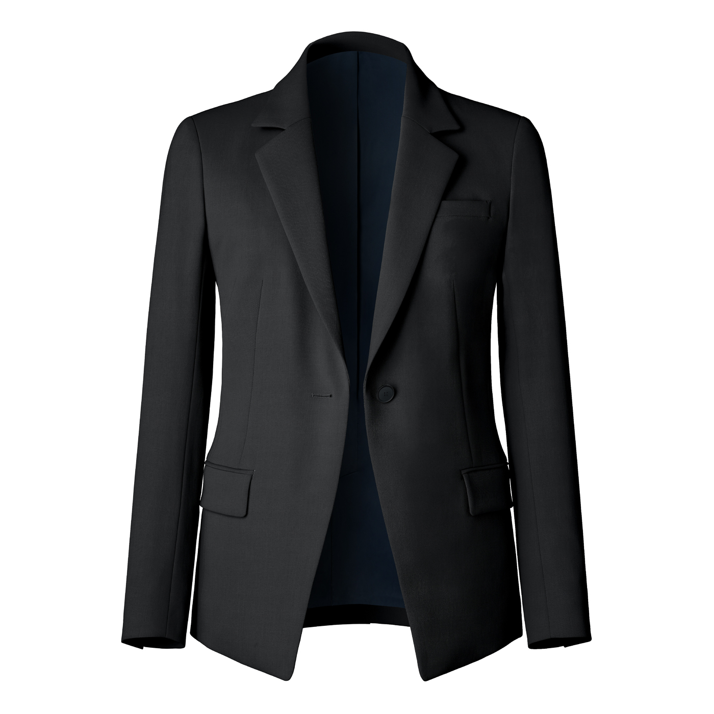 ジャケットの前下がりのシルエットが特徴的