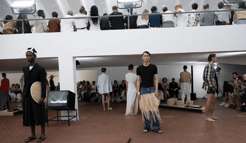 そしてアフリカの滝の霧に着想を得た滑らかなドレープが各所に生かされ、椰子の編みを使ったオーバースカートや帽子などがプリミティブなアクセントになっている。