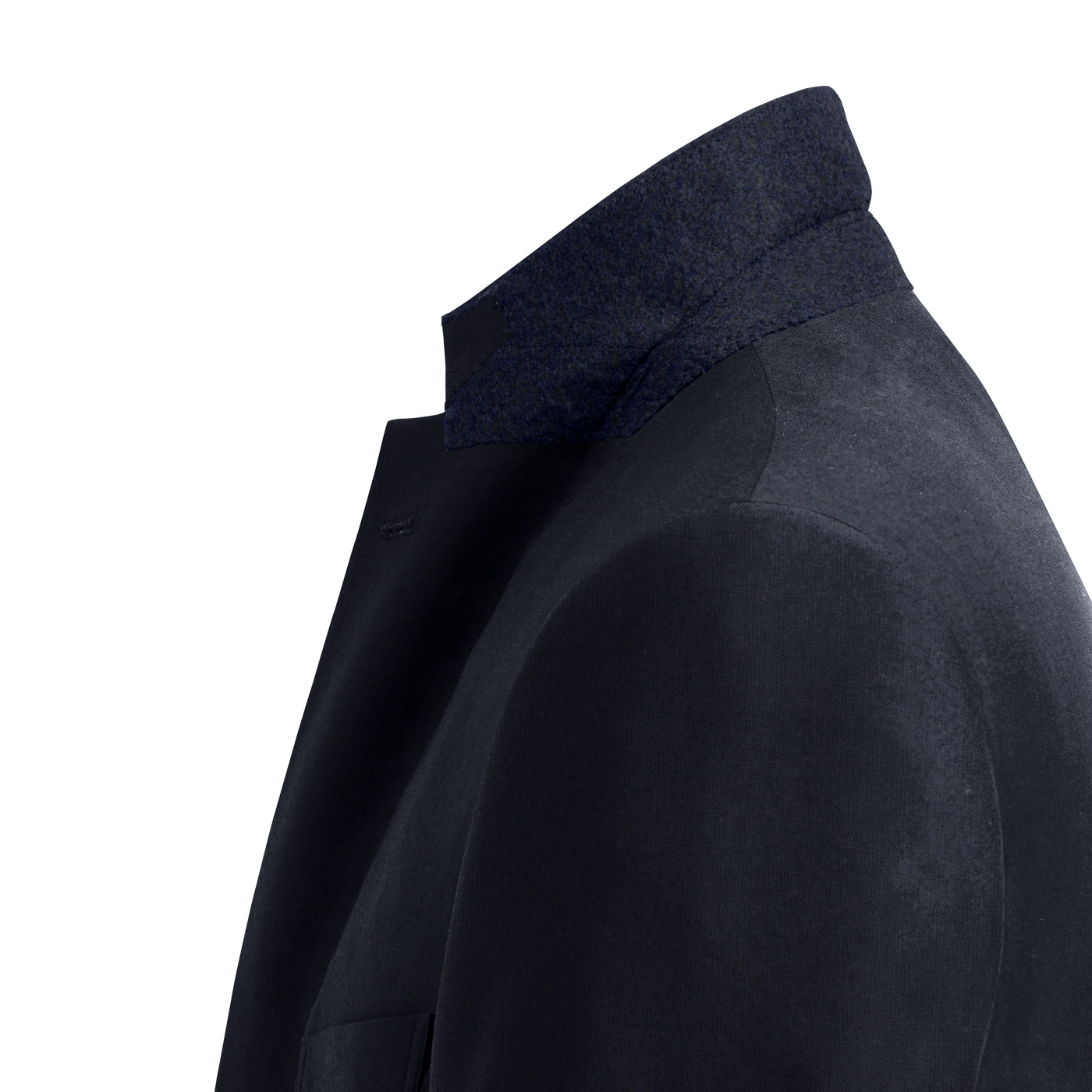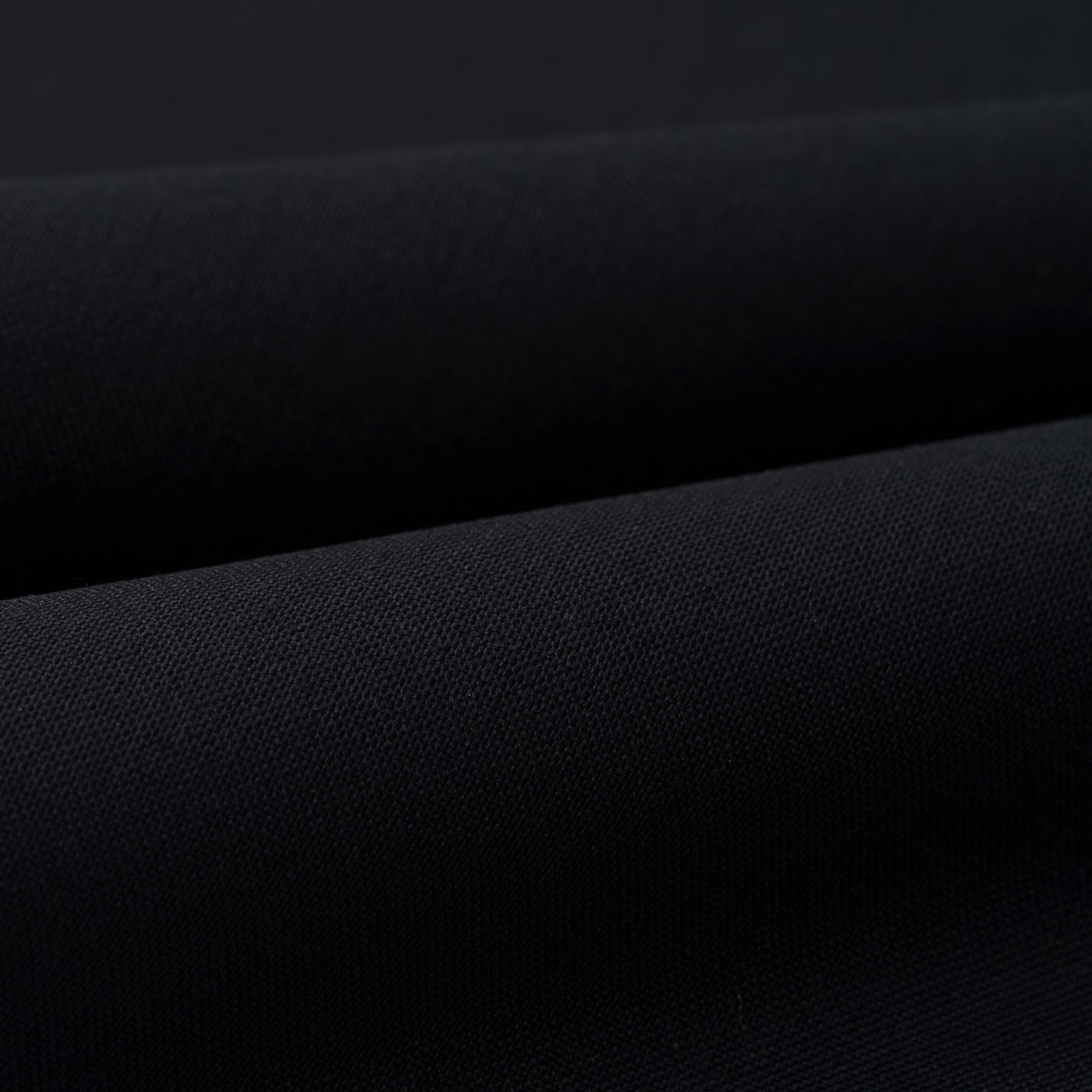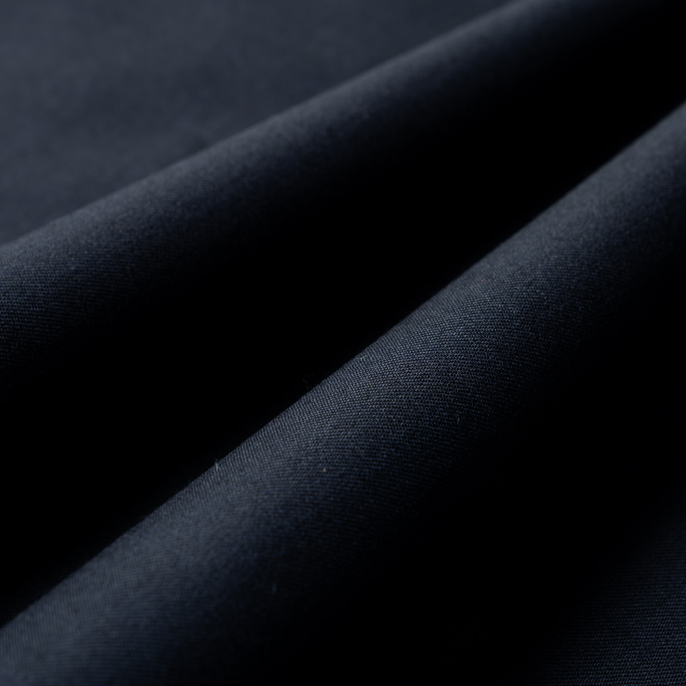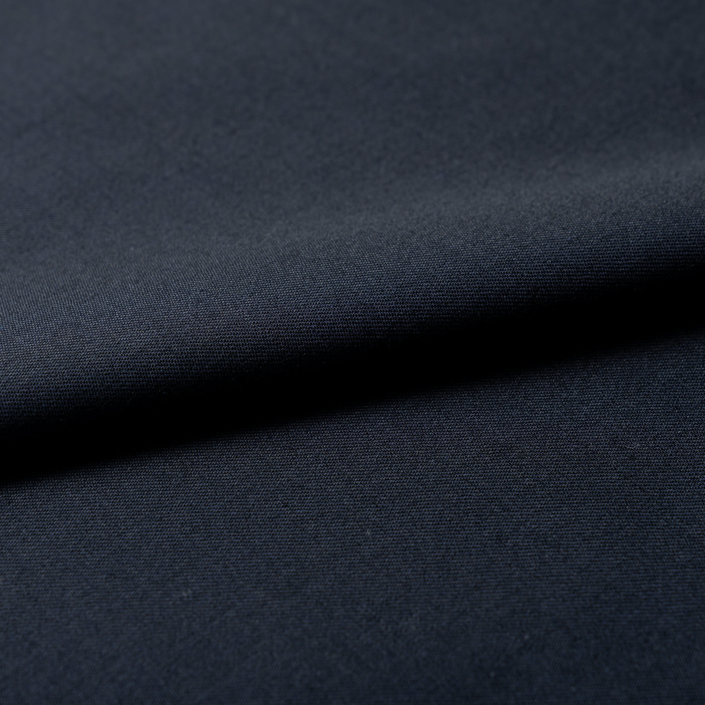 FABRIC TOKYOのオリジナル生地。ウール100%のため艶がきれいで、ナチュラルなストレッチ性も兼ね備えています。こちらで紹介しているディープダークネイビーは、3つの中では一番黒に近いネイビーなので、どんなシーンでも着れる一着をお探しの方におすすめ。