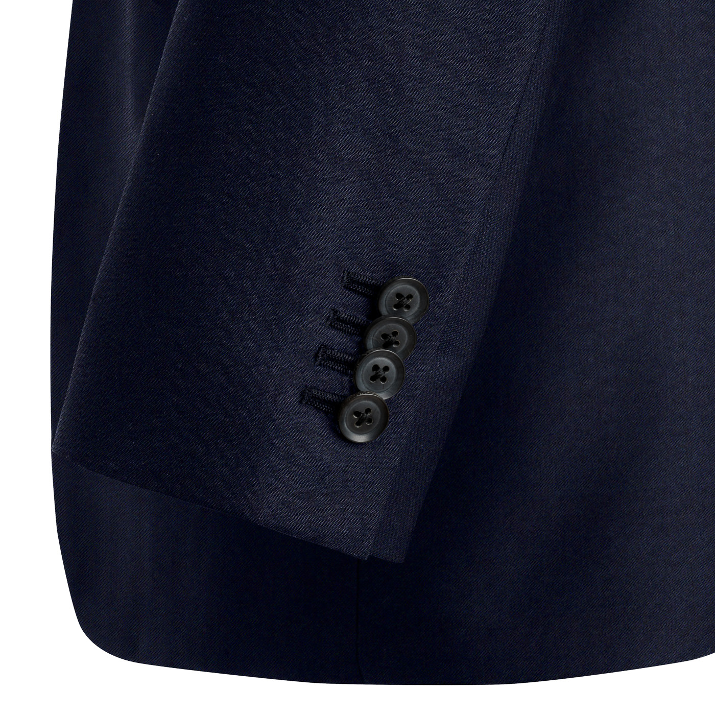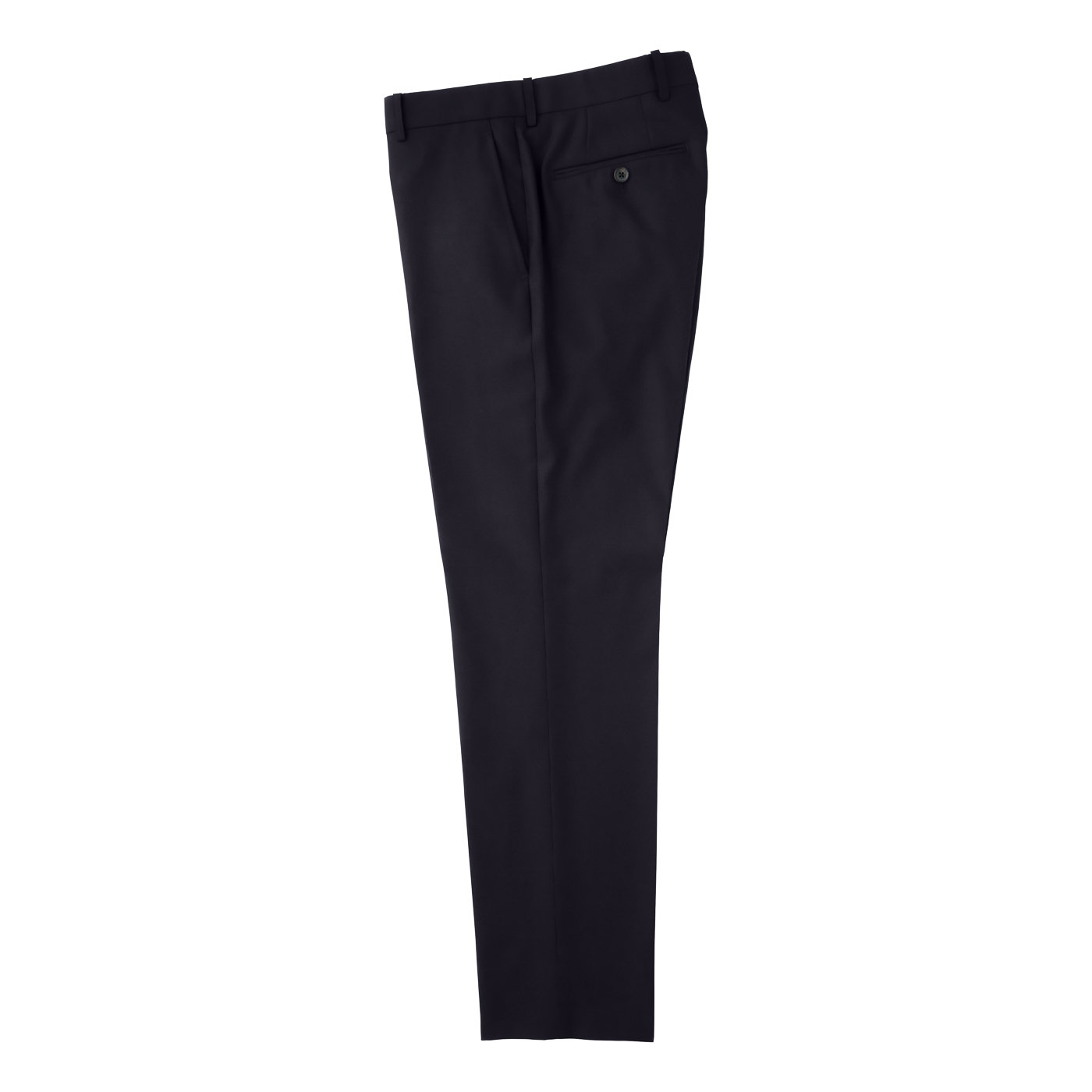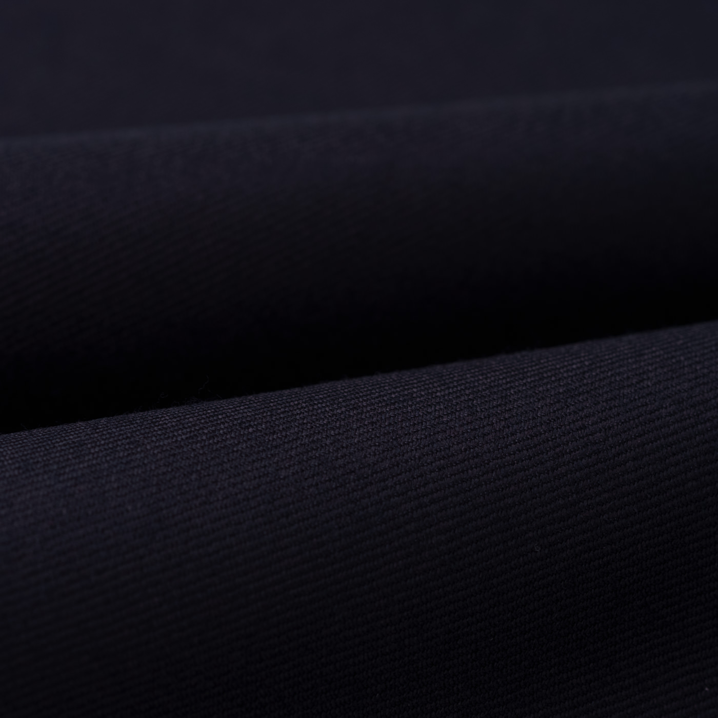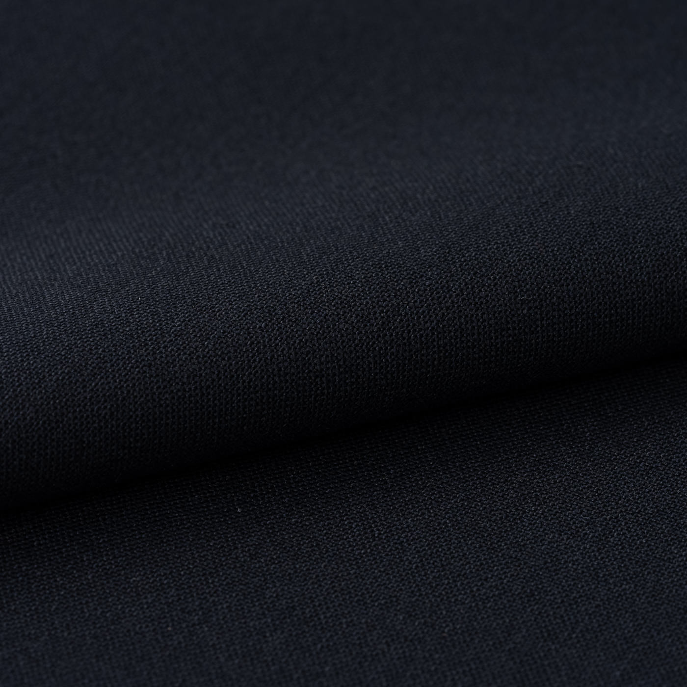 FABRIC TOKYOのオリジナル生地。ウール100%のため艶がきれいで、ナチュラルなストレッチ性も兼ね備えています。こちらで紹介しているディープダークネイビーは、3つの中では一番黒に近いネイビーなので、どんなシーンでも着れる一着をお探しの方におすすめ。