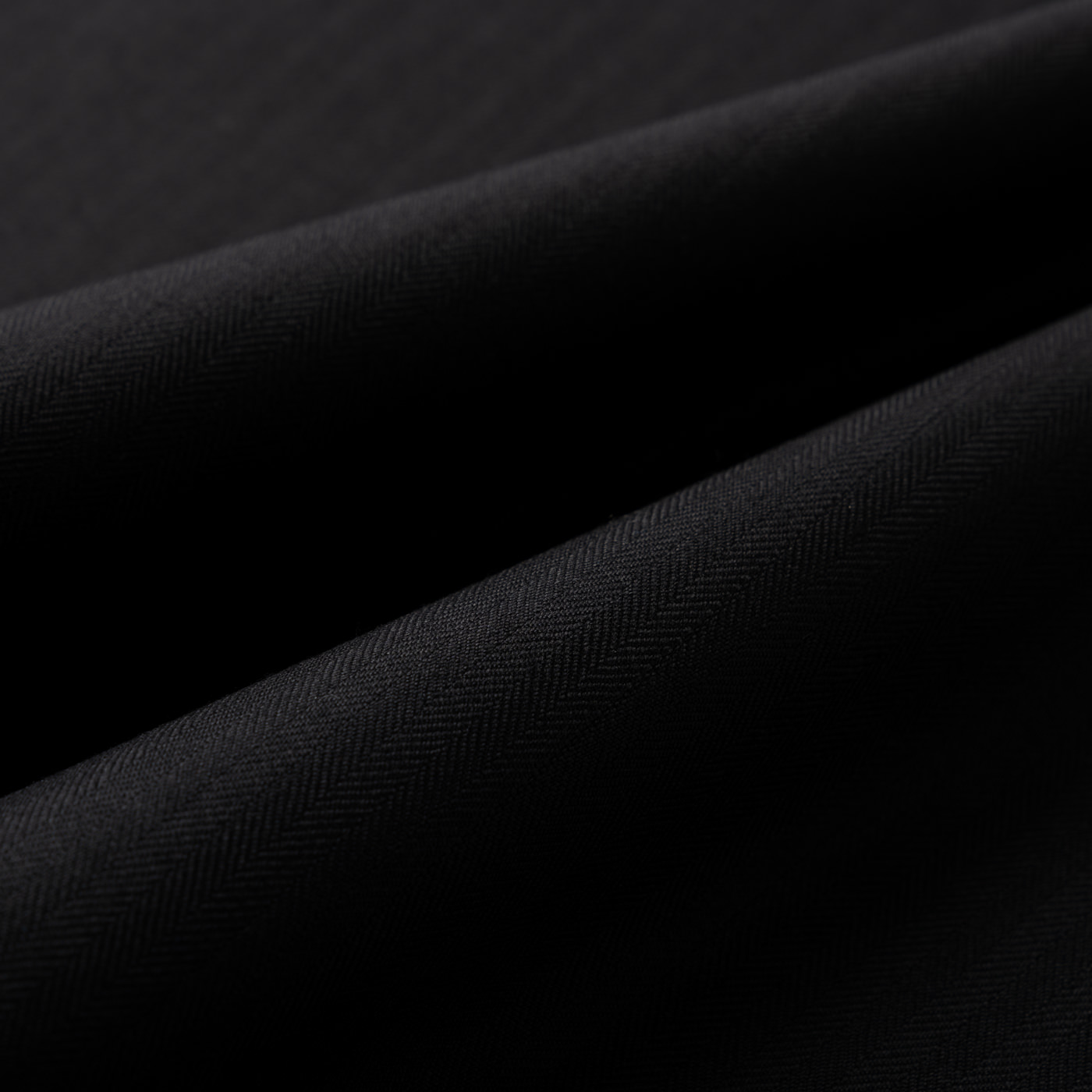ウールとシルクをブレンドしたエレガントなダークネイビースーツに、同じ生地のヘリンボーンベストをコーディネート。