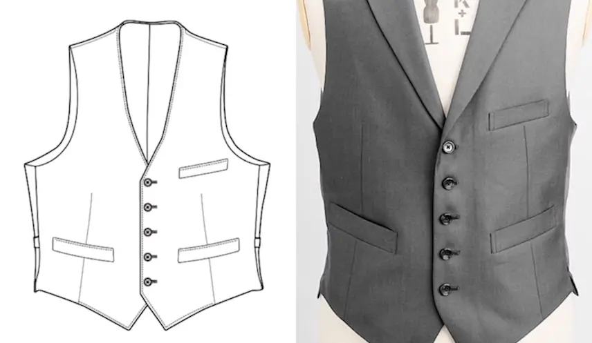 ベストのフロントデザインは、オーソドックスな「5ボタン5つ掛け」が定番ですが、6つのボタンがありながら、1番下のボタンは飾りになっている「6ボタン5つ掛け」も人気です。この場合、一番下のボタンはあくまでも飾りなので留めません。