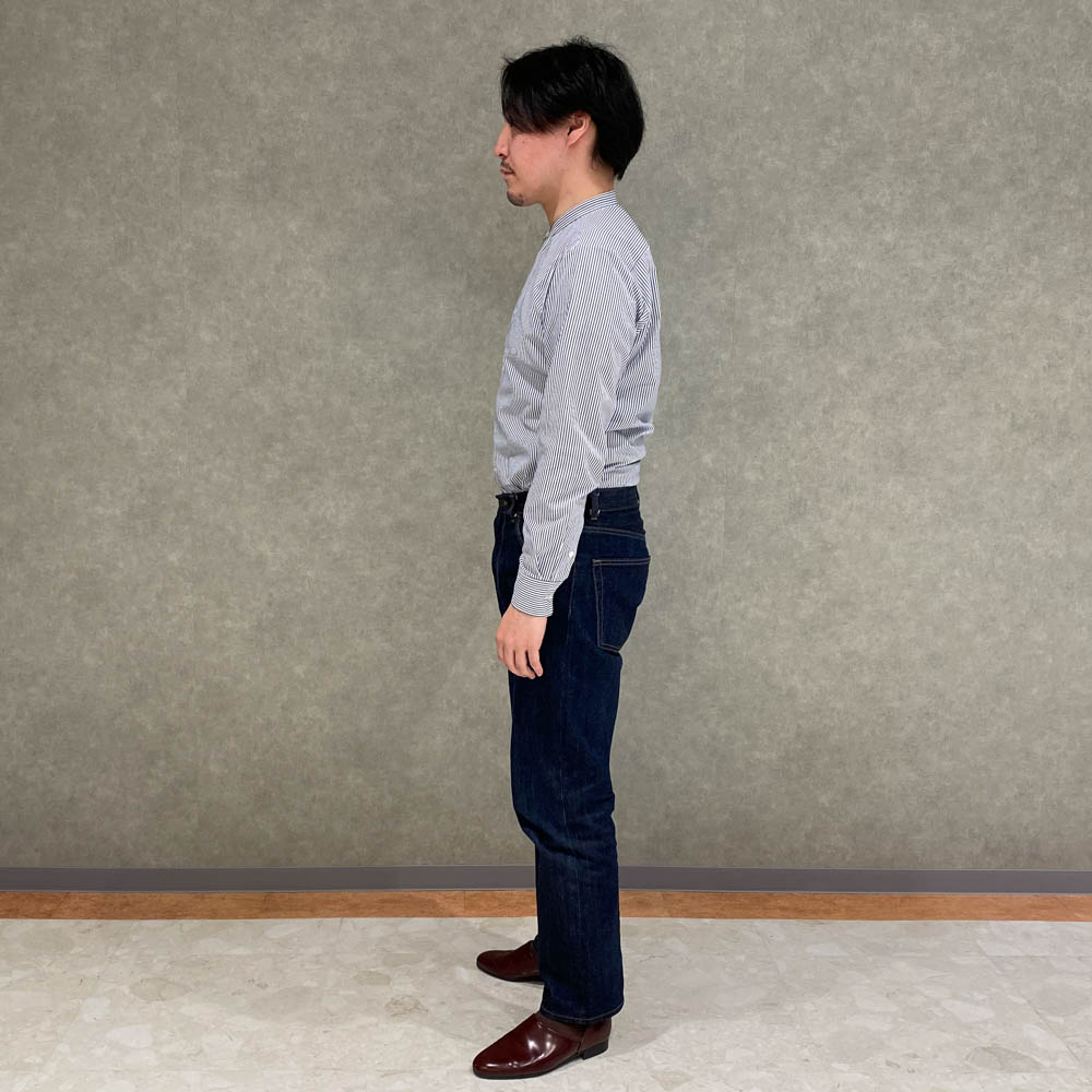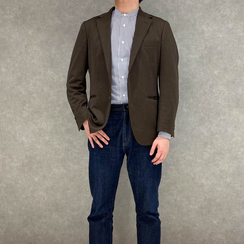 ストライプのシャツはスタンドカラーをチョイスすると、デニムとも相性の良いカジュアルなスタイルに。
