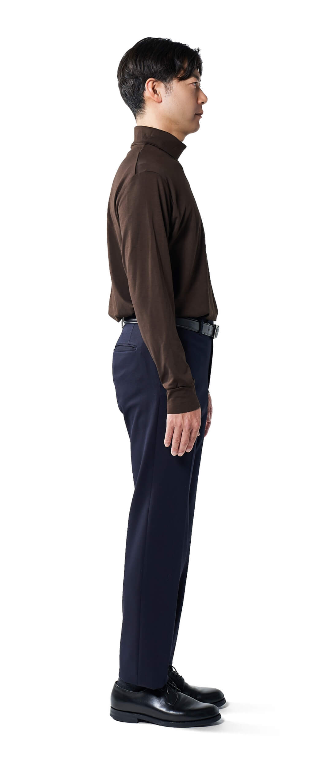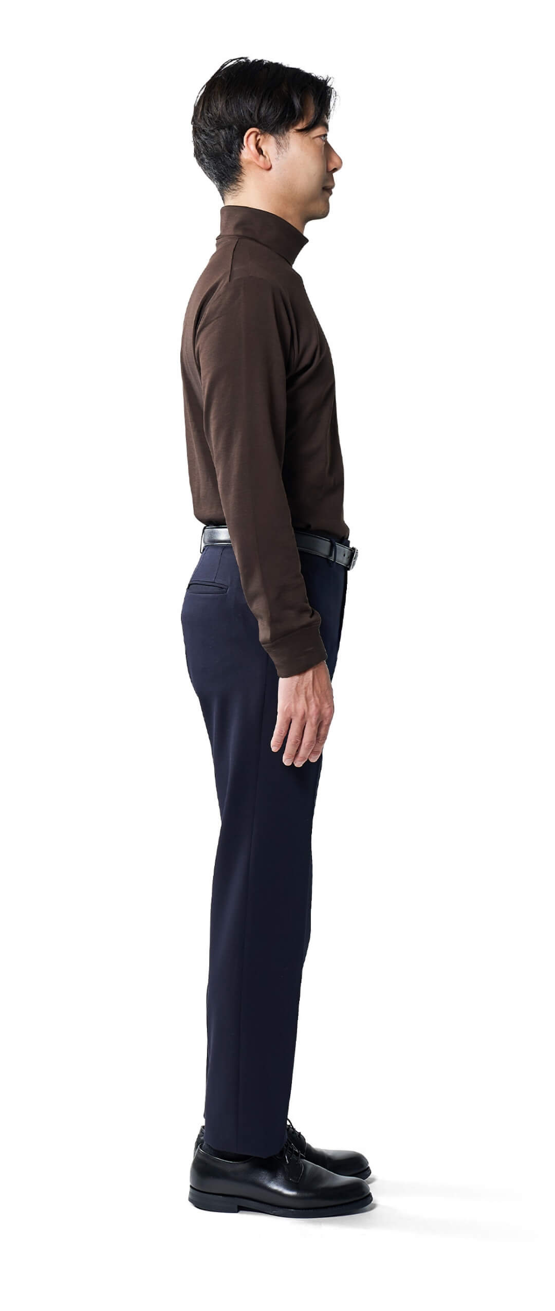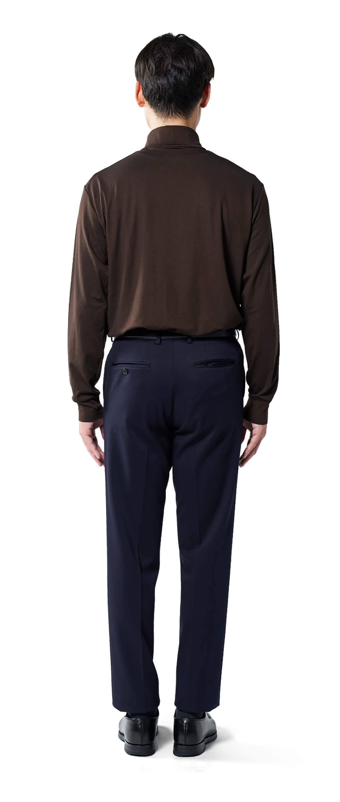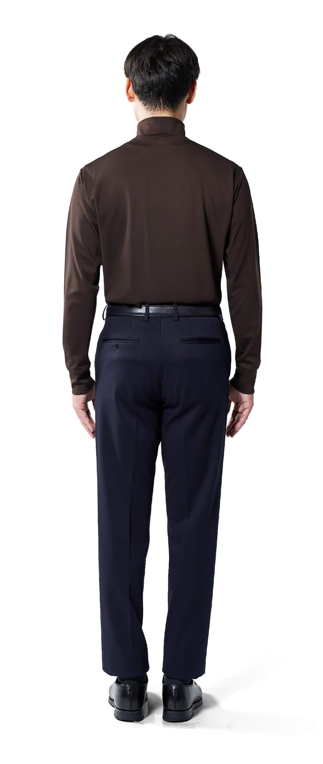 高すぎず、低すぎない。ジャケットを着た時にちょうどよく映えるネックの高さが上品さを演出し、ワイシャツとは違った個性も添える。
