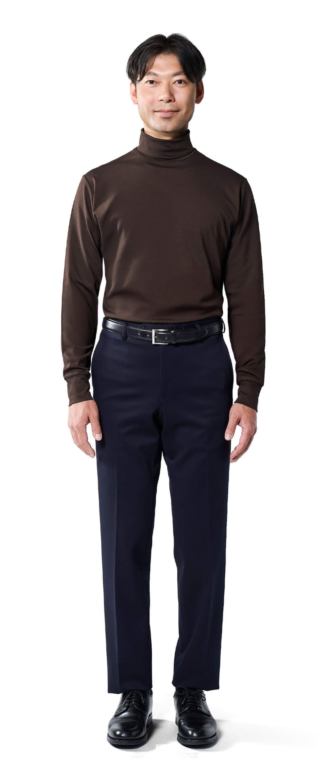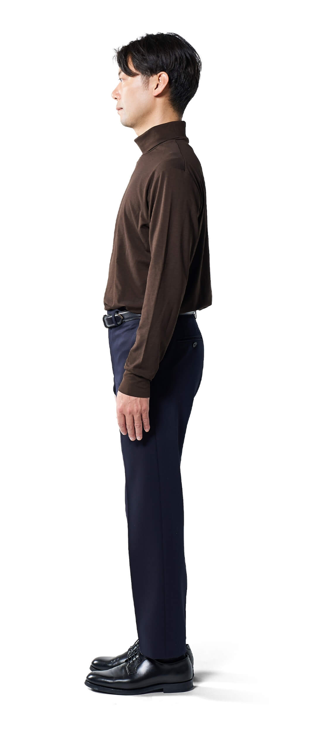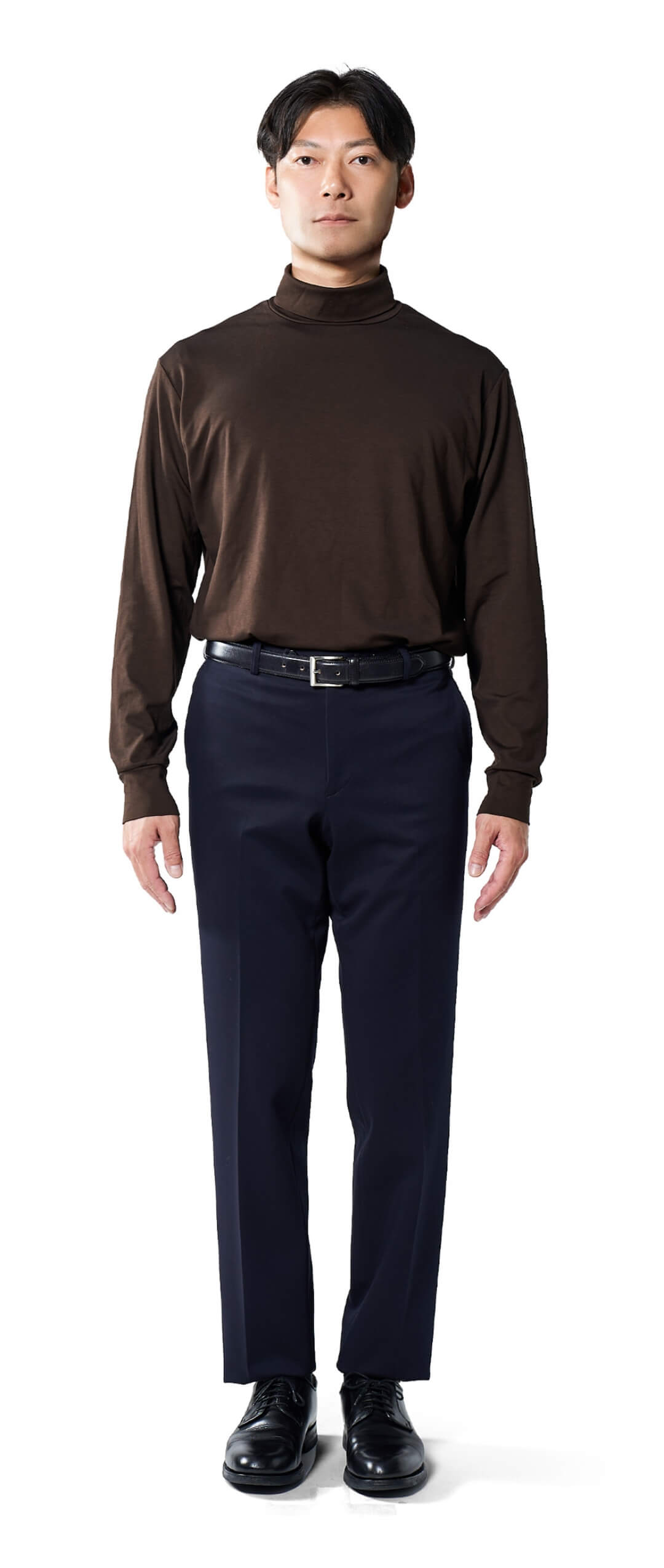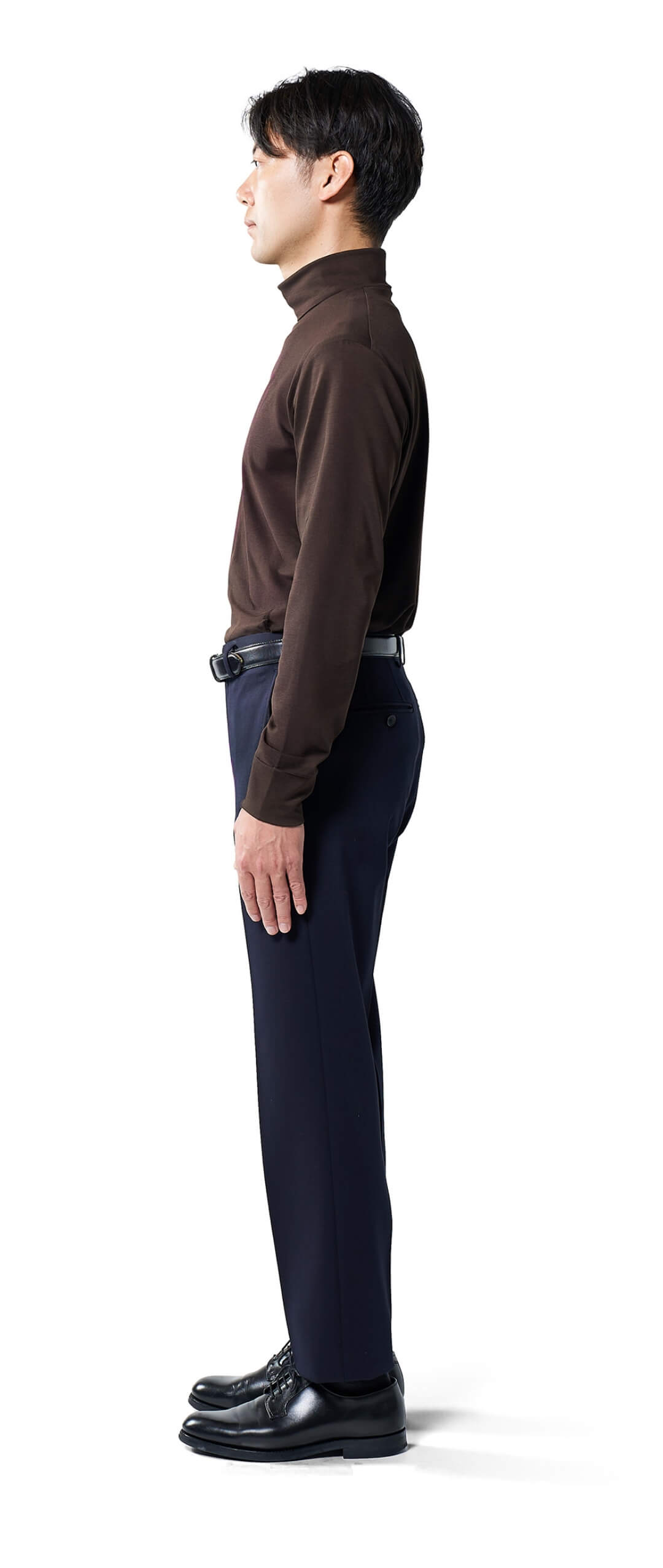高すぎず、低すぎない。ジャケットを着た時にちょうどよく映えるネックの高さが上品さを演出し、ワイシャツとは違った個性も添える。